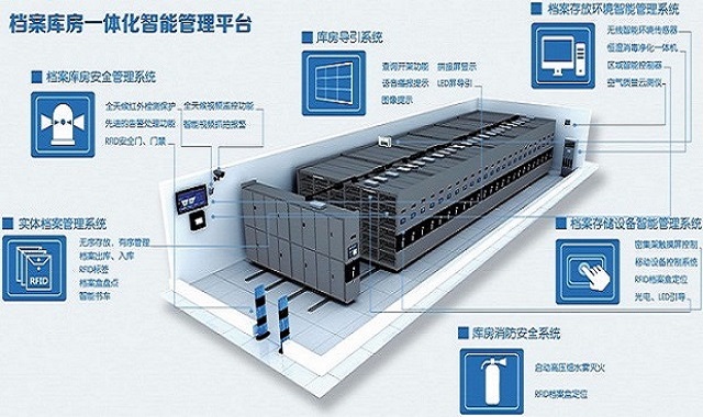 智慧档案馆一体化平台基于物联网、云计算、大数据、档案人健康防护、档案安全防护等新技术,实现了档案的收、管、存用全业务流管理。智慧档案平台实现了档案实体资源与数字资源的集中 建设与管理,实现了档案和档案人安全与健康极致防护。